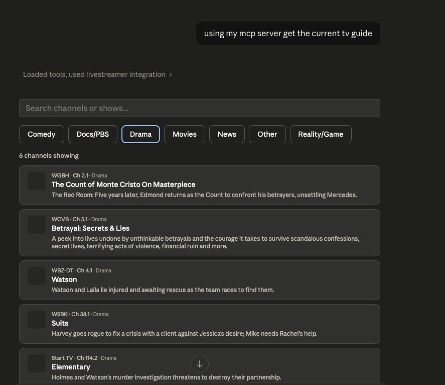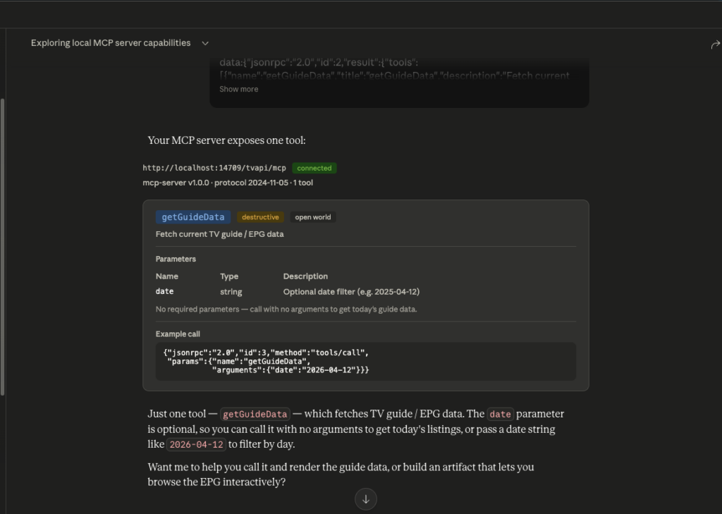 If you follow this blog you are likely aware that AI has been heavily used in the development of LocalTV+. I am currently experimenting with an MCP integration. At the moment it is functional but doesn’t do much it is more of a novelty. Claude (or another AI ) can pull the guide data and you can click through it to see what is on in different genres and see highlights. However, I think some kind of on device agent keeping track of what you like or recommending shows (with the data never leaving your device) could be some thing fun like the old Tivo recommendations that could helped people discover content they wouldn’t ordinarily watch. Something to keep experimenting with for now.